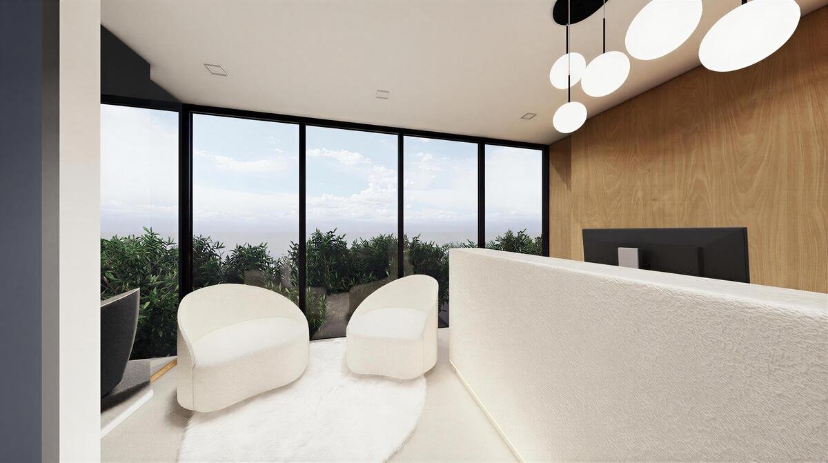 El lobby del proyecto ha sido concebido como un espacio de bienvenida elegante y funcional, donde la calidez de la madera se combina con líneas limpias y una adecuada selección de materiales. El mobiliario de diseño, la iluminación decorativa y los amplios ventanales crean una atmósfera serena y sofisticada, permitiendo que la luz natural y la vegetación exterior se integren de forma armónica al interior.